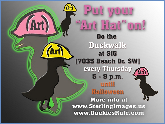 The opening of SIG on August 13, 2009, was such a success that we decided to do a weekly, Thursday evening Duckwalk (like an Art Walk, only way more fun) every Thursday in September and October of 2009. Below is a copy of the official Duckwalk flyer. Weekly drawings for one child and one adult ducky item (t-shirt or calendar) took place.