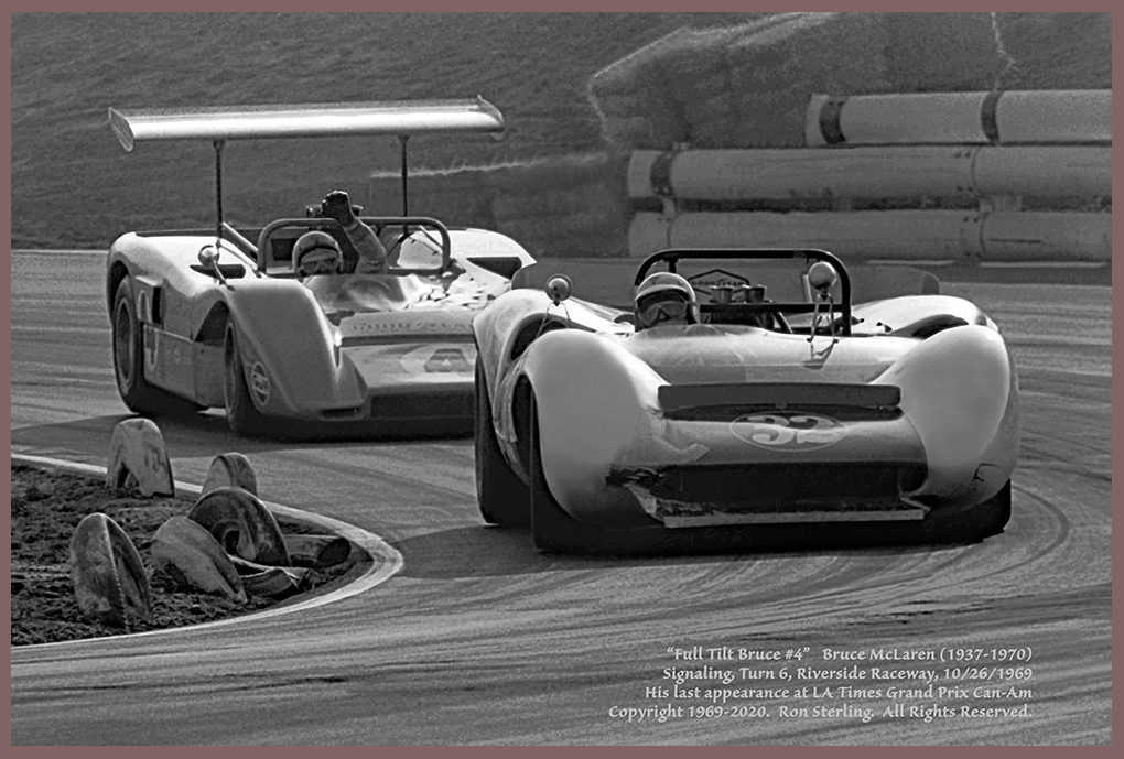 This is a one-of-a-kind photograph of Bruce McLaren signaling to pass the Lola driven by Vic Nelli in the 1969 LA Times Grand Prix, Can Am, October 26, 1969. Bruce was notorious for passing wide at Turns 6 and 7. He did not finish the 1969 race due to an accident. His teammate, Denis Hulme finished first. Denis Hulme finished first at Riverside in 1969, 1970 and 1971.