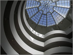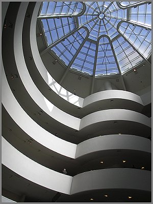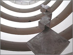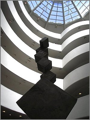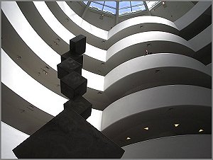 The Guggenheim Museum was created by famous United States architect, Frank Lloyd Wright, and it was built between 1956 and 1959. Frank Lloyd Wright died at about the time the first part of the museum construction was completed. The museum has undergone revisions and additions since 1959. The metal sculptures that appear in four of the photographs were part of the "David Smith -- A Centennial" exhibition that took place at the New York City Guggenheim February 3 to May 14, 2006. Widely considered the greatest sculptor of his generation, David Smith (1906–1965) created some of the most iconic works of the 20th century. Marked by the use of industrial materials, especially welded metals, and the integration of open space, Smith's three-dimensional version of Abstract Expressionism revolutionized the art of sculpture in the U.S. and around the world. You can read more about its history at New York City Guggenheim Museum. It is interesting to note that David Smith's "Sentinel" Series was started in 1956 and his most famous series, "Cubi," was undertaken between 1961 and 1965.